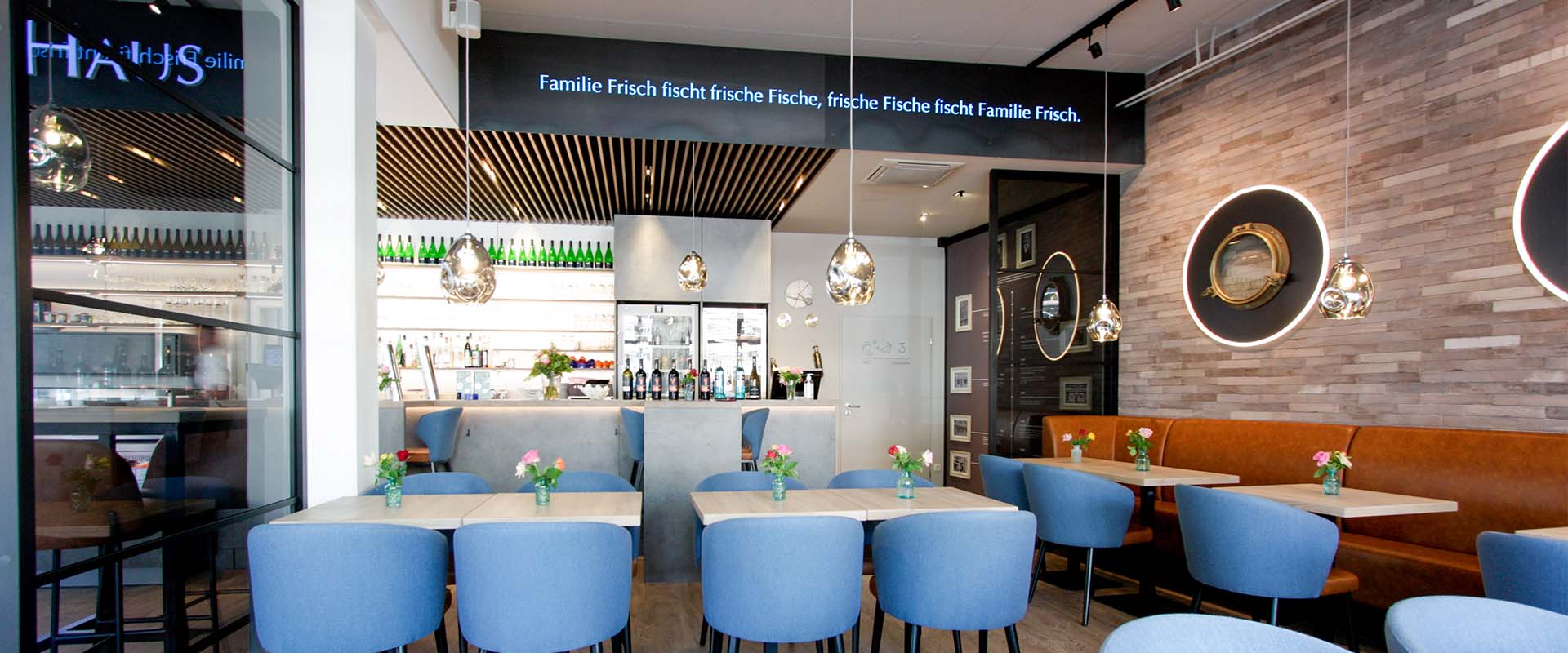 Spezielle Materialien, wie Klinker und Echtstahl, verleihen dem traditionsreichen Fischrestaurant in Hannover-Kirchrode einen neuen, modernen Charme, der rustikal und trotzdem hell und gemütlich wirkt. Durch bewusst eingesetzte Gestaltungselemente entsteht eine geschickte Zonierung zwischen Verkaufs- und Verzehrfläche: Der dunkle Tresen mit Holzlamellendecke trennt sich als eigener Bereich gut vom restlichen Restaurant ab – unterstützt durch die beleuchtete Schrift oberhalb des Tresens. Der Verzehrbereich kontrastiert durch abgedunkeltes Glas mit Sprossen und die Pendelleuchten über den Tischen ergeben einen besonderen Blickfang. Eine Zeitstrahlwand, die die Geschichte der Familie wiedergibt, rundet als Highlight das Erscheinungsbild stilgerecht ab.