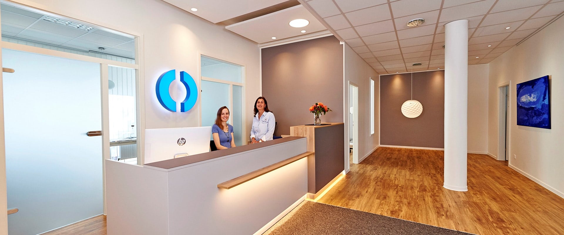 Die Gemeinschaftspraxis in Hannover besticht durch ihren warmen und wohnlichen Charakter. Der Bodenbelag in Holzoptik und die warmen Wandfarben verleihen den Räumlichkeiten eine Atmosphäre, in der sich die Patienten direkt wohlfühlen. Der neue Tresen nimmt den warmen Holzton des Fußbodens auf und steht in Kontrast zu den sonst schlichten Farben und Formen. Im Empfangsbereich wirkt das Logo der Arztpraxis als Blickfang für ankommende Patienten.