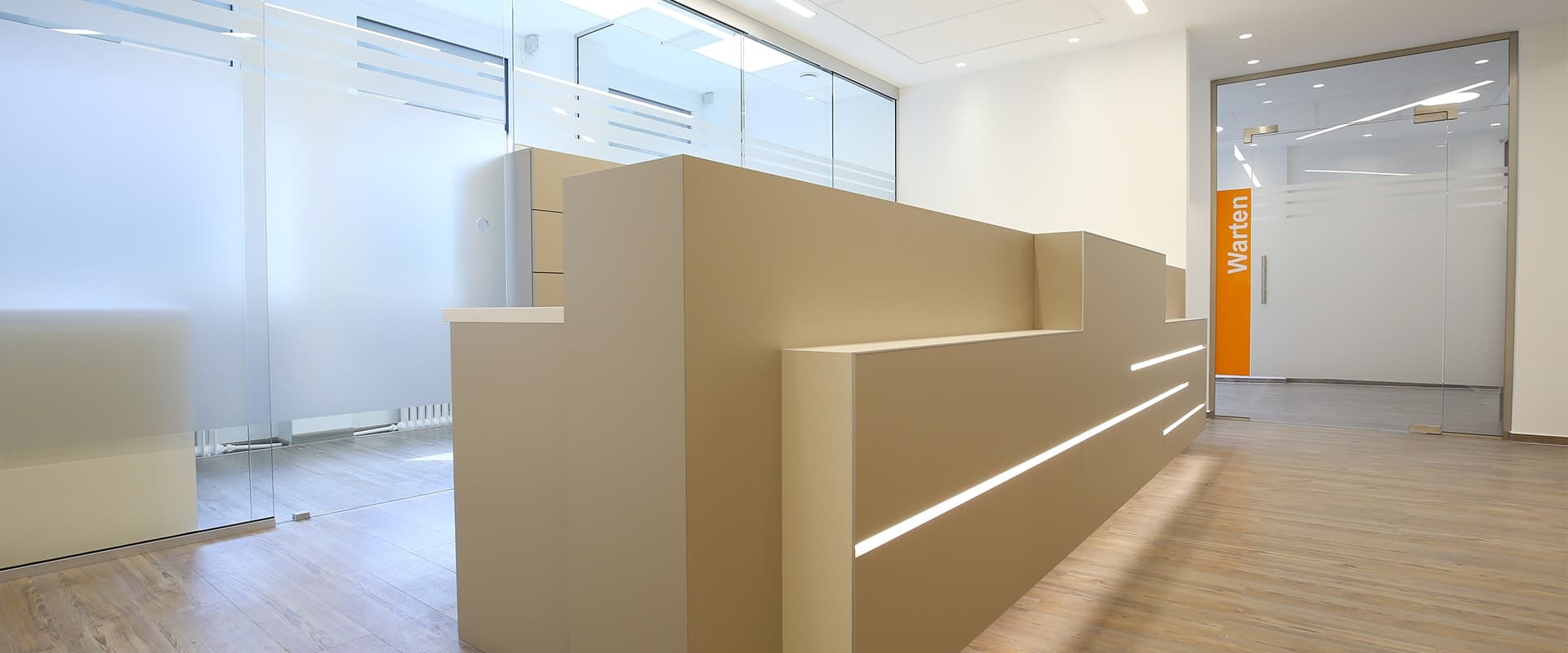 Die Hautarztpraxis im Herzen von Hannover wird durch das außergewöhnliche Lichtkonzept im Zusammenspiel mit den warmen Farben geprägt. Die Decke über der Anmeldung ist dabei ein besonderer Blickfang, der sich in seiner Formgebung im Tresen wiederfindet. Im Kontrast hierzu stehen die weiche Optik sowie die warme Farbe des Tresens. Im gesamten Design stechen einzelne orange Farbakzente hervor. Das hinter dem Tresen befindliche Back-Office bringt durch die Verglasung Tageslicht in die Praxis und bietet gleichzeitig Diskretion.
