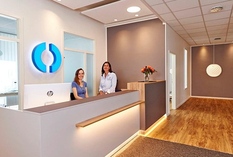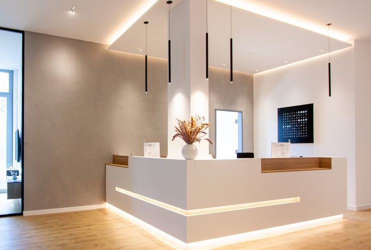 Eine Mischung aus modernem Design und gemütlicher Atmosphäre! Die warmen Holzlamellen und elegantes, dunkles Glas schaffen zusammen mit abgesetzten Decken in Schwarz eine einzigartige Wohlfühlumgebung. Hier trifft stilvolle Klarheit auf Gemütlichkeit. Abgerundete Wände schaffen fließende Übergänge zwischen den einzelnen Bereichen, was die Praxis offen und einladend wirken lässt.