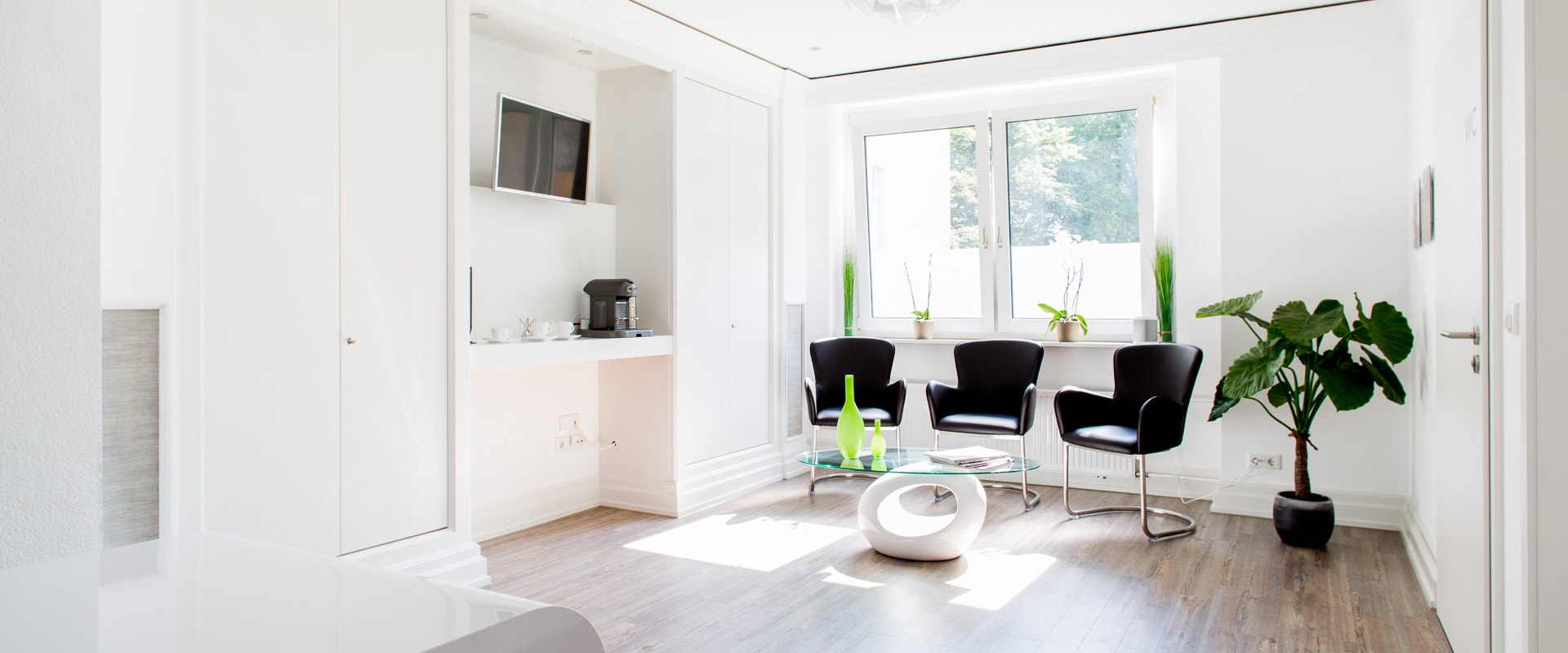 Die Osteopathie im Zooviertel kombiniert seit der Umgestaltung modernes Praxisdesign mit alter Bestandsarchitektur. Das schlichte Konzept erhält durch besondere Formgebung und Materialien einen wohnlichen, hellen Charakter. Die alten Stuckleisten brechen die klaren Formen auf, dank viel Glas wirkt die Praxis großzügig und offen.