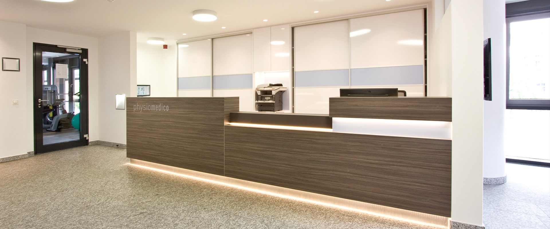 In der Physiotherapie List wirkt der Empfangstresen als zentraler Anlaufpunkt. Das dunkle Holz erzeugt in Verbindung mit den weißen und hellblauen Wandflächen ein spannungsreiches und harmonisches Gesamtbild.