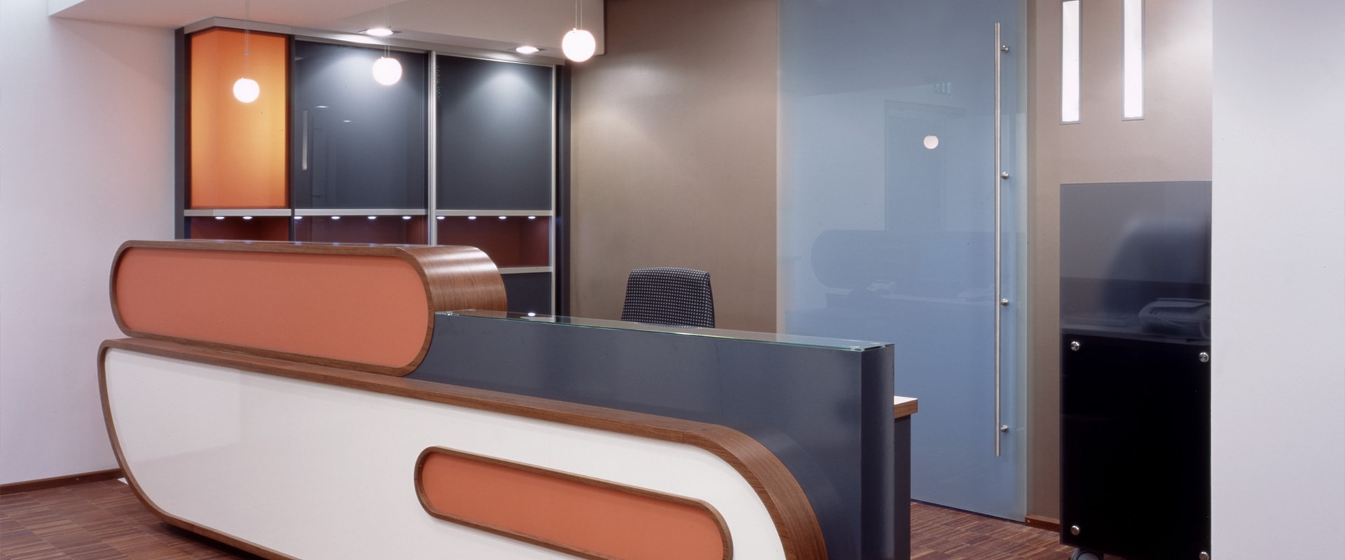Die besondere Formgebung des Empfangstresens der Screening-Praxis in Hannover hebt sich von der geradlinigen Architektursprache der Praxis ab. Die warmen Töne kommen durch die zurückhaltende Farbgebung der Wände besonders gut zum Vorschein. Dazu wurde der geräumige Flur mit Sitznischen ausgestattet. Dies ermöglicht eine optimale Nutzung der Fläche, ohne sie optisch zu trennen.
